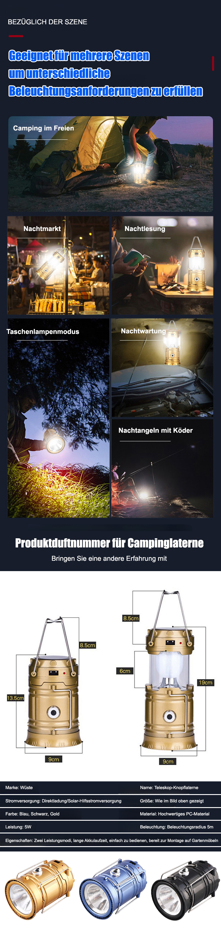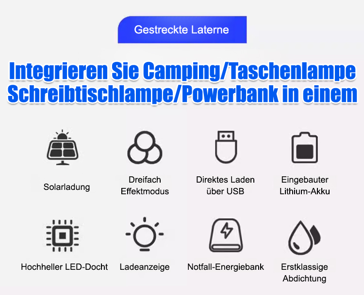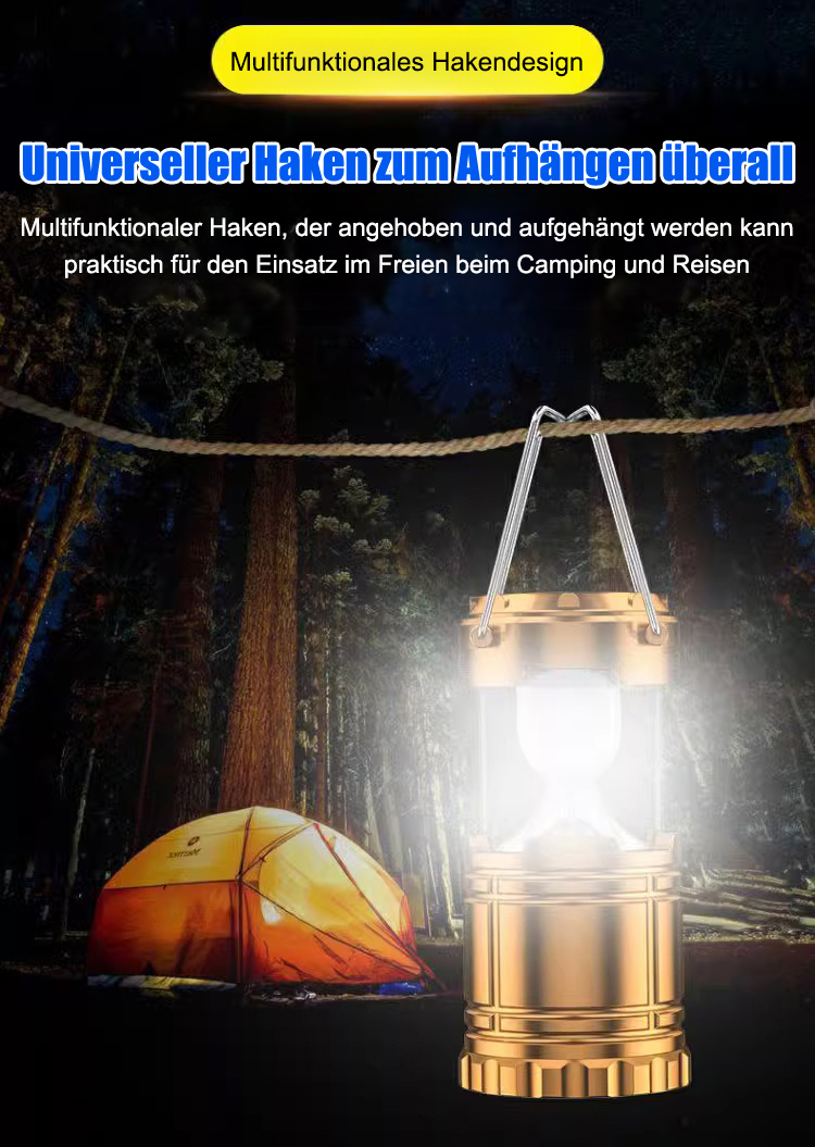 Nutzt Solarenergie und ist extrem leistungsstark! Hochleistungs-Solarpanele liefern kontinuierliches Licht ohne Batterien – für Ihre Sicherheit überall und jederzeit.☀️ Extrem langlebig! Diese stoß- und wetterfeste Zeltleuchte leuchtet hell auch bei Stürmen, starken Stößen und anspruchsvollen Campingbedingungen im Freien.🌧️ Lässt sich blitzschnell zwischen Taschenlampe, Leselampe und Zeltleuchte umschalten. Ideal für Notfälle, nächtliches Lesen und flexible Montage.💡 Offiziell zertifiziert und wasserdicht getestet – bietet zuverlässige Not- und Außenbeleuchtung für amerikanische Haushalte.✅